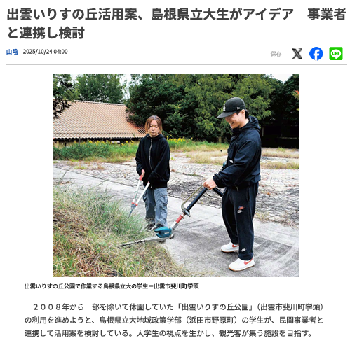 2025年10月24日付の山陰中央新報にて、出雲いりすの丘の取り組みが紹介されました。